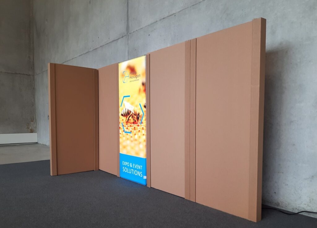 C’est encore plus simple avec notre système de cloisons ECOPANEL ! Il permet de monter un stand pop-up solide en un rien de temps. Le système de cloisons ECOPANEL se compose de panneaux alvéolaires en carton recyclé et de profilés en carton dur. Le montage est très aisé ! Tout est simplement emboîté les uns […]